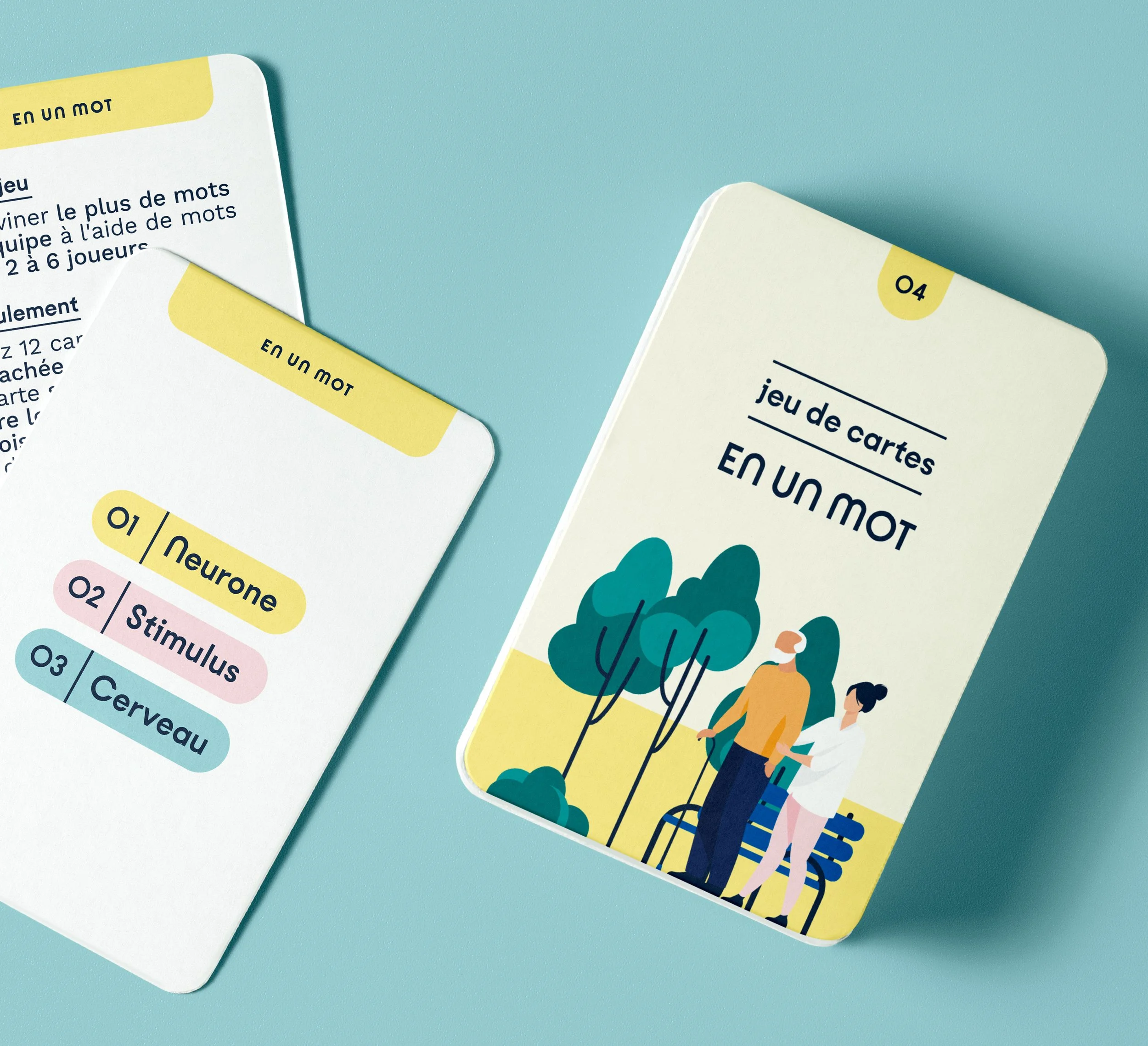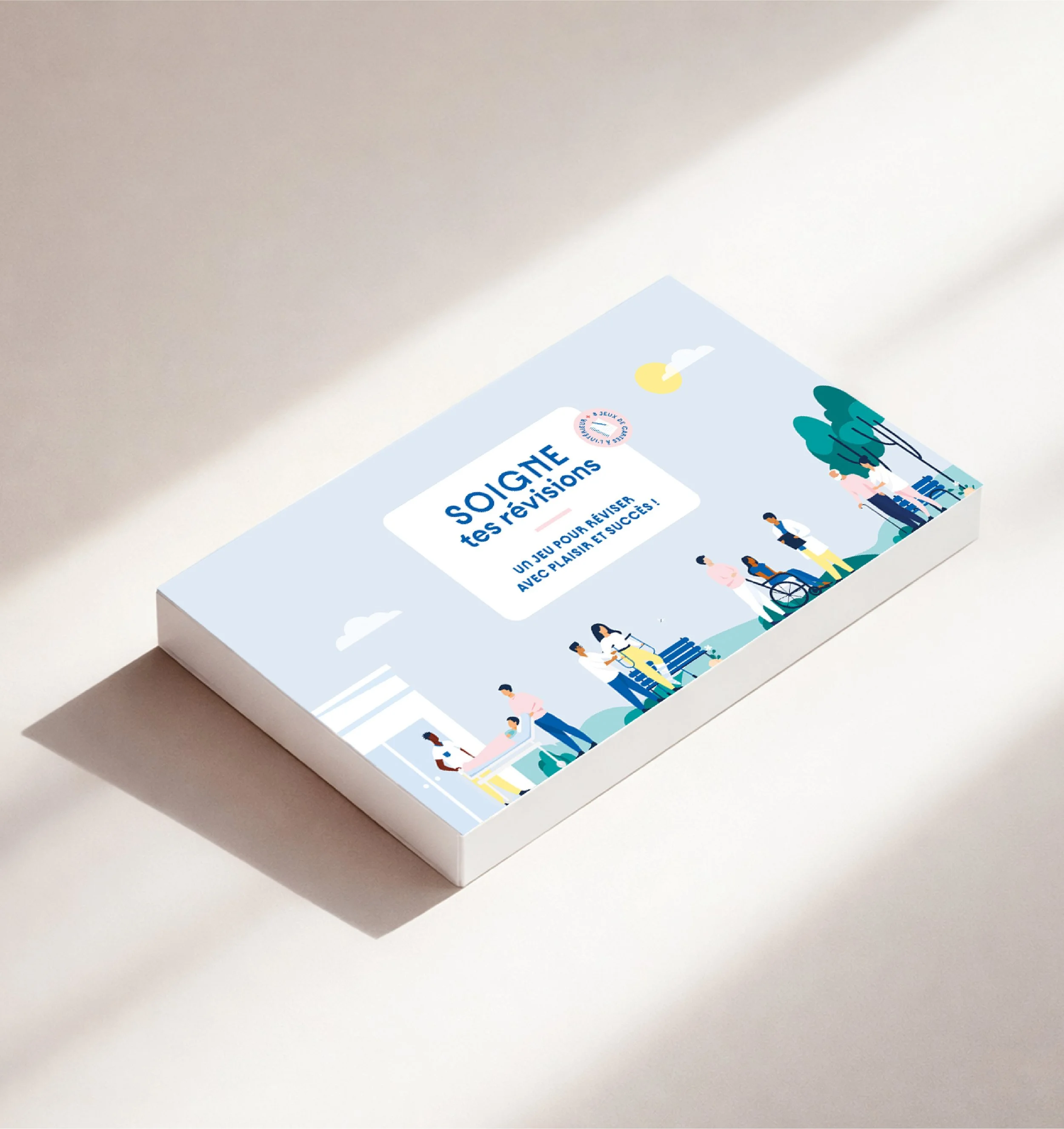 Création de l’identité visuelle et mise en forme complète du jeu de société. La direction artistique repose sur des illustrations minimalistes, claires et accessibles à tou·tes. L’univers visuel évoque à la fois le milieu médical et la dimension pédagogique du jeu. La palette chromatique s’inspire des codes hospitaliers et de la psychologie des couleurs, tout en garantissant une lisibilité optimale dans un contexte professionnel.